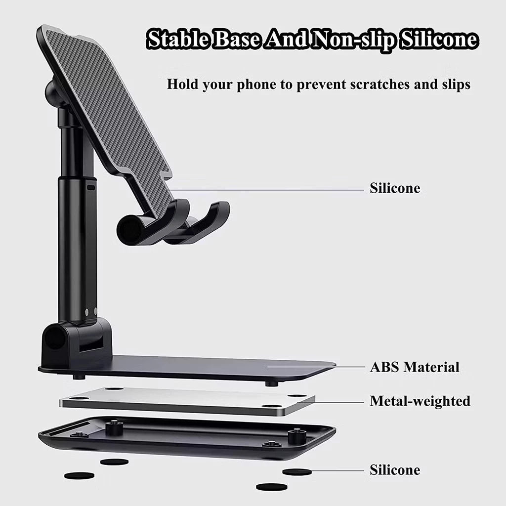 A base antiderrapante garante firmeza em qualquer superfície, enquanto o apoio de silicone protege seu celular contra riscos e deslizamentos.